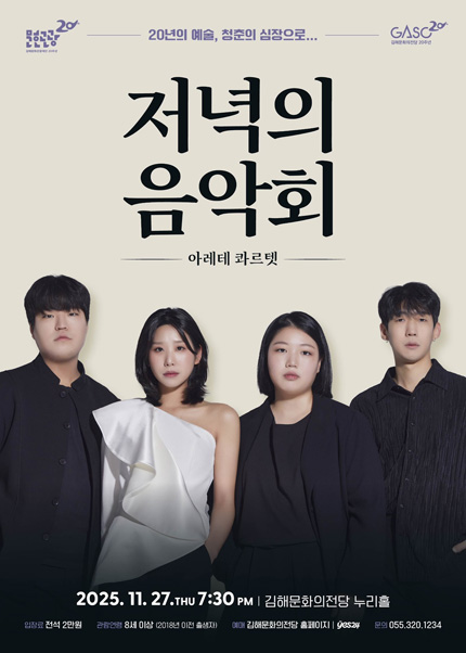 저녁의 음악회 아레테 콰르텟 김해 (11월) 25.11.27(목) ~ 11.27(목) |