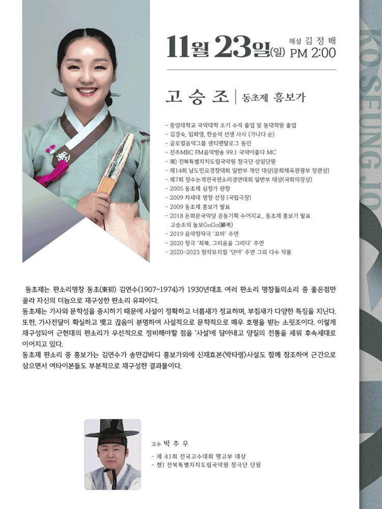 유파별 해설이 있는 판소리 다섯바탕 Ⅱ 고승조의 동초제 흥보가 전주 25.11.23(일) ~ 11.23(일) |